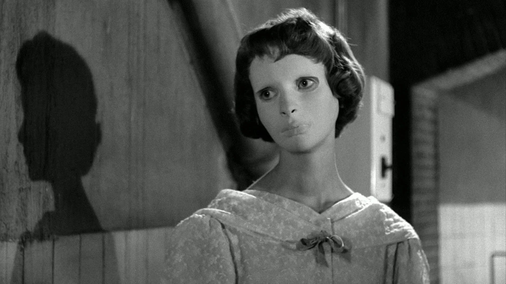 The design, set against a textured background with high-contrast black and white tones, mimics the worn, vintage feel often associated with classic horror. The use of the manipulated image pays homage to the 1960s horror film Eyes Without a Face, further enhancing this aesthetic.
